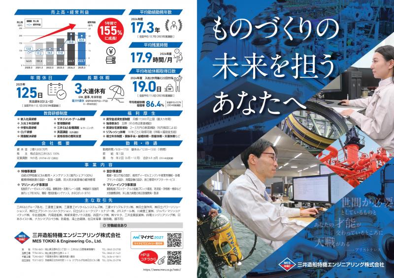 長年の造船業で培ってきた高度な技術力を活かし、様々な領域へ事業を展開。手厚い福利厚生で安心して働ける環境です。【年間休日127日(26年度予定)】【奨学金返済支援制度】